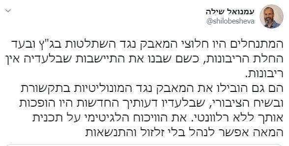 מה שבאמת מרגיז בציוץ הזה הוא העובדה שלולא המתנחלים החננות האלה, שחיו בתת תנאים בראשית הדרך, ומאז מקיזים את דמם – מילולית - על גבעות יהודה ושומרון, עסקת טראמפ כלל לא הייתה מגיעה לעולם ולא היה על מה להחיל ריבונות. אם באמת היו המתנחלים (גילוי נאות: הכותב נולד בחולון שבגוש דן ומתנחל מקצועי כבר 16 שנים, כן ירבו) כאלה גורנישטים, היה הרבה יותר קל לקבוע את מפת הקונספט שבזכותה מעז טאוב לזלזל בהם. אבל אחרי כל כך הרבה שנים שבהם הסאטירה השמאלנית ומיטב הפובליציסטים כינו אותנו בשלל כינויים, גידלנו כבר עור כזה שחסין גם למר טאוב.