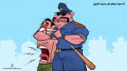 השוטר הסורי סותם בכוח את פיו של האזרח וקושר את ידיו מאחור. אך, האיש האומלל בכל זאת מצליח להשמיע את זעקתו מהבטן הריקה והרעבה שלו. שכן, אומר המאייר, אי אפשר להשתיק את הרעבים ולסתום להם את הפה.
