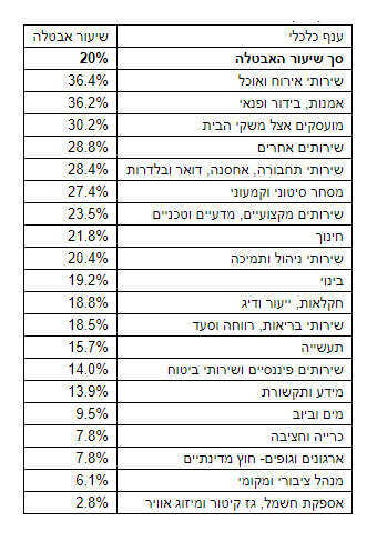 מצד אחד שירותי אירוח ואוכל - 36.4 אחוזים, אמנות, בידור ופנאי - 36.2 אחוזים ומועסקים במשקי הבית - 30.2 אחוזים.