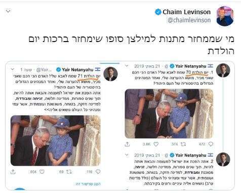 חיים לוינסון מהארץ זיהה שברכתו של יאיר נתניהו לאביו לכבוד יום הולדתו ה-71 שחל השבוע דומה במדויק לברכת יום ההולדת שצייץ לכבודו בשנה שעברה ביום ההולדת ה-70. מה נגיד? עד 120.