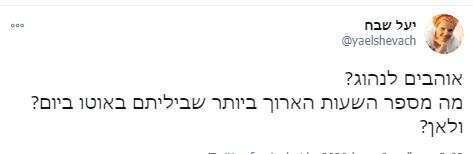 יעל שבח, צייצנית שהצטרפה לטוויטר לפני 7 שנים אבל רק בחודשים האחרונים צברה תאוצה והחלה לצייץ בקביעות להנאת עוקביה, יכולה לספק למדור הזה שרשור מעניין מדי שבוע. זה מנהג די קבוע אצלה לזרוק שאלה לחלל הפיד וליהנות מהתגובות של הצייצנים שמשתפים חוויות ופעולה: