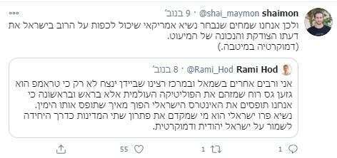 מה שבאמת מדהים בסיפור הזה הוא שיש אנשים שכותבים את זה במפורש. כמו מנכ"ל המרכז הרעיוני בקרן ברל כצנלסון, רמי הוד, שמעיד על עצמו שהוא מאמין במדינת רווחה יהודית ודמוקרטית שכל אזרחיה שווים. אבל נראה שיש לו פרשנות אחרת למה היא דמוקרטיה - מבחינתו אם ארה"ב תתערב עכשיו, יהיו אזרחים שהפתק שלהם יהיה שווה פחות: