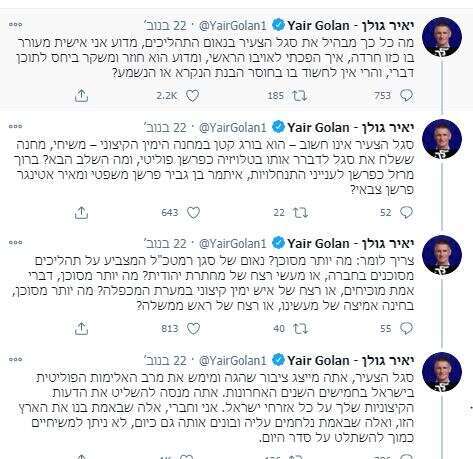 סגל, כזכור, לא פראייר וכבר הזמין אותו להסיר את חסינותו על ציוצים קודמים - אך לא נענה כמובן - ותבע את דוברו של גולן בתביעת דיבה. אבל לא זה הסיפור. הסיפור הוא שהציוצים הללו מלאים בפייק ניוז, הגזמות פראיות, שקרים וסטיגמות מופרכות שרק אדם עם חסינות פרלמנטרית היה יכול לכתוב.