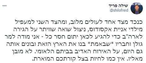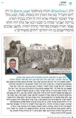 נקודה נוספת מלמדת בעיקר איך חש הציבור האשכנזי, הלבן והשמאלן ש"גנבו לו את המדינה". בציוץ הזה יצא המרצע מן השק. קשה לגולן להסתיר עד כמה זה מבאס שהזיזו לו את הגבינה.