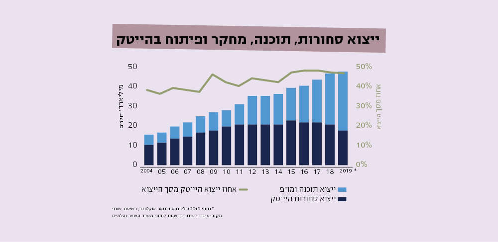 הכלכלה החדשנית תופסת נתח גדול במיוחד מהכלכלה הישראלית - לפי הערכות מסוימות כ־20 אחוזים מהתמ"ג הישראלי נובע מהכלכלה החדשנית. על פי רשות החדשנות, בשנת 2019 ייצוא ההייטק הישראלי הגיע לשיא של כ־45.8 מיליארד דולר, שהם כ־46% מסך כל הייצוא בישראל (גידול של כ־1.2% ביחס להיקף ייצוא ההייטק בשנת 2018). מספר השכירים המועסקים בענפי ההייטק עמד בשנת 2019 על כ־321 אלף עובדים, גידול של כ־26 אלף עובדים בשנה. שיעור השכירים העובדים בהייטק עומד על 9.2 אחוזים מכלל השכירים במשק. חלקו של ההייטק מהכלכלה והתעסוקה הישראליות גדול בהרבה בהשוואה למדינות אחרות, וכך גם השפעתו על הכלכלה הישראלית גדולה מכל מדינה אחרת.