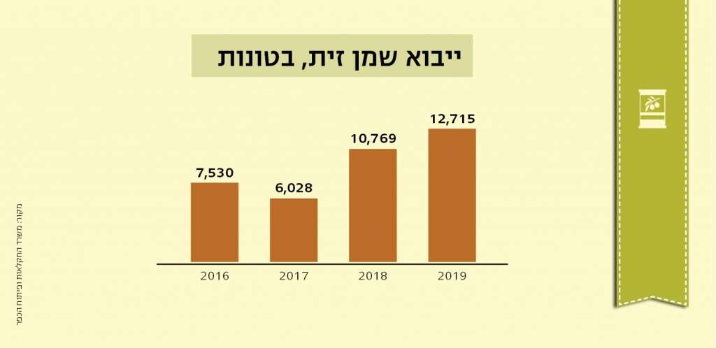 מתוך כ־7 מיליון ליטרים של שמן זית שנמכרו בישראל ב־2019, רק 720 אלף הם שמן זית ישראלי 100% בעל תו איכות מקומי של משקים כמו אליעד, ג'השאן, חלוצה, משק אחיה וכו'. כ־3 מיליון ליטרים מיובאים לארץ בבקבוקים ונמכרים כמו שהם, ללא שינוי. יתר שמן הזית הנמכר בישראל הוא למעשה שמן זית מהתעשייה המקומית המערב שמן זית המיובא בצוברים בתוספת כמות מסוימת של שמן ישראלי, בשיעור שאינו ידוע ואינו מסומן על הבקבוק.