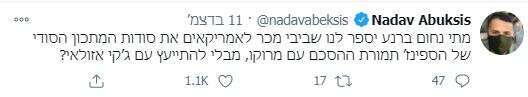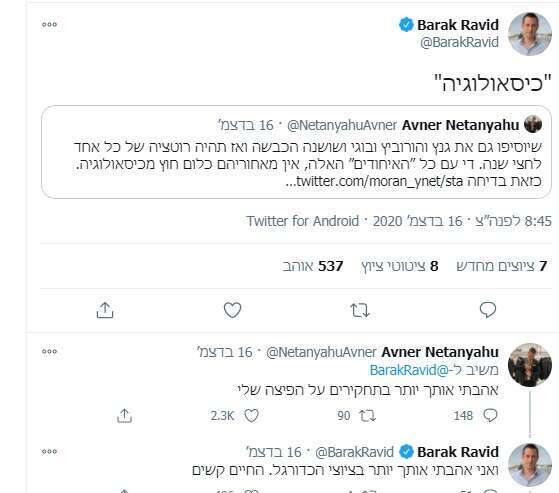 אפרופו התחקיר של ברק רביד על הפיצה והכלב והפרות הסגר של משפחת נתניהו בפסח, אירוע היסטורי נוסף קרה השבוע חוץ מהסכמים עם בהוטן ומרוקו. אבנר נתניהו, לא יאיר, הבן שעד היום התייחס בטוויטר רק לאירועי ספורט, נתן את השנקל שלו על הצעת איווט ליברמן לאיחוד בגוש הציוני, והראה שהוא יודע לעקוץ לא פחות טוב מהאח הגדול: