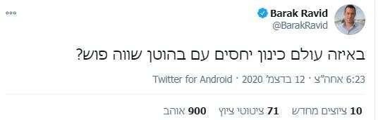 תשומת לב מיוחדת קיבל הכתב המדיני של וואלה, לשעבר כתב בערוץ 13 והארץ, ברק רביד על הציוץ הזה: