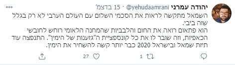 לסיכום, יהודה עמרני, בניגוד לפרשנות המקובלת, מסביר שזה לא קשור רק לאסכולת "רק לא ביבי":
