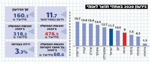 הגירעון בתקציב המדינה יסתכם בשנת 2020 בכ־11.7 אחוזים מהתוצר המקומי הגולמי, מהגירעונות הגבוהים בעולם המערבי על פי התחזיות. בכל העולם ההוצאות הרקיעו שחקים השנה, אבל ישראל נכנסה למשבר בגירעון של כ־52 מיליארד שקלים. נקודת הפתיחה הייתה גרועה, ומשם המצב רק הידרדר.