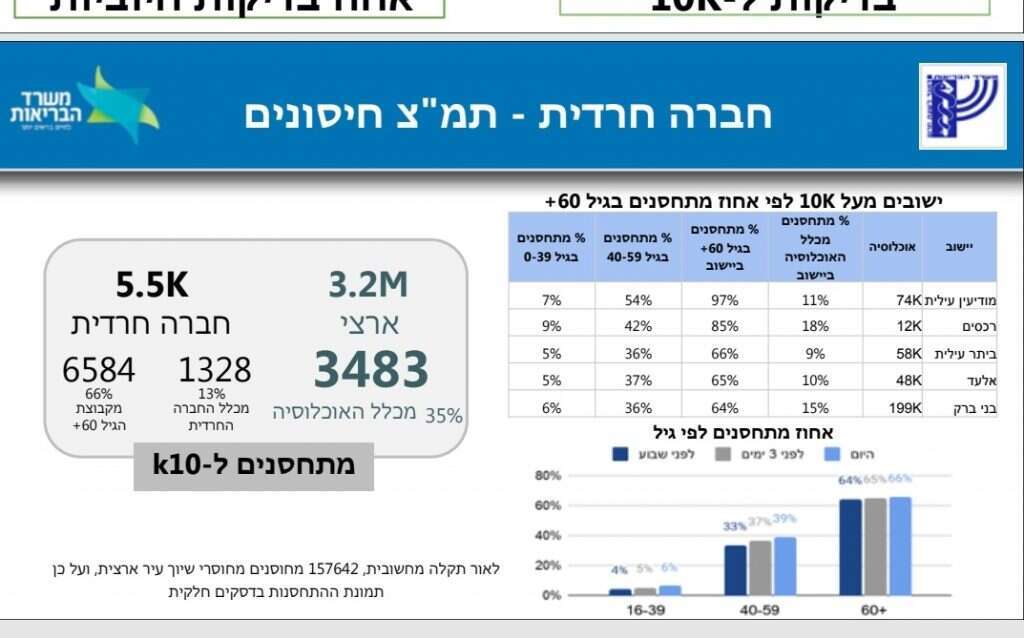 אבל אם הולכים שעה אחת אחורה, ב-19:53, כתב הערוץ יאיר שרקי פרסם בטוויטר נתון קצת שונה: אחוז המתחסנים בגילי +60 במודיעין עילית עומד על 97(!).
