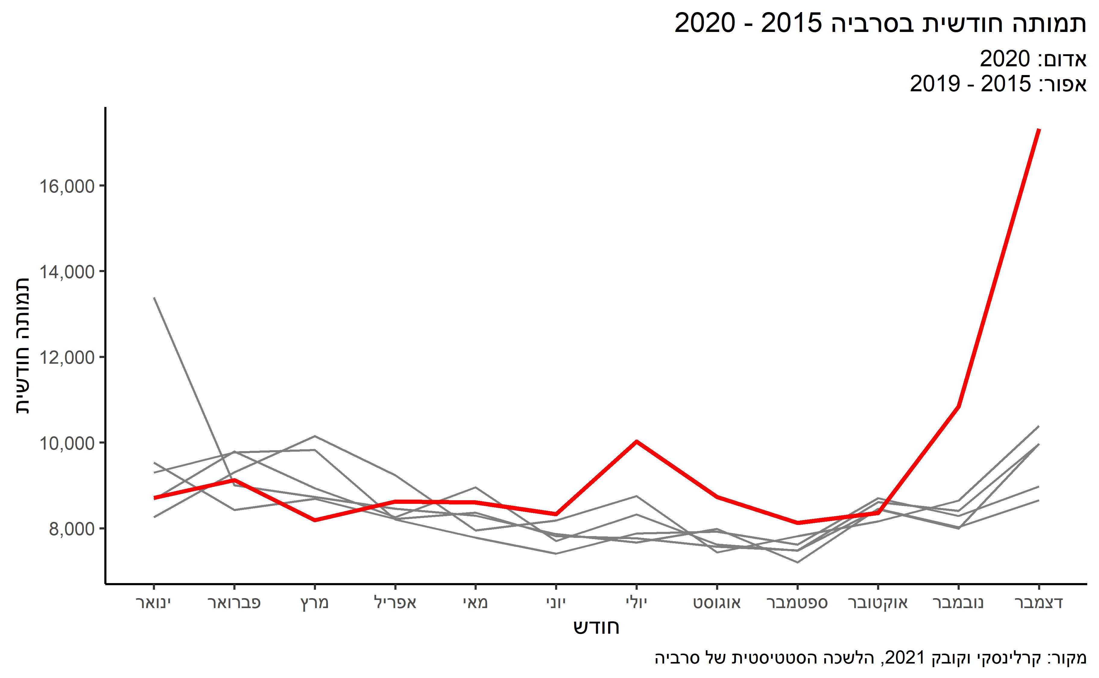 נתחיל עם סרביה. לאחר סגר הדוק עם פרוץ המגפה במרץ-אפריל, לא נרשמה כמעט התפרצות של הנגיף בתחומי המדינה, בדומה למדינות מזרח אירופה אחרות שפעלו אז באותו אופן. אך, בדומה לישראל, החל הנגיף שב להרים את ראשו בספטמבר-אוקטובר. האזרחים התמרדו במגבלות והממשלה ירדה מהרעיון של הטלת סגר נוסף. התמותה שם מקורונה אכן לא זינקה. נס? מכרים סרבים מדווחים על חוסר אמון בנתוני התמותה מקורונה שהממשלה שם מדווחת מאז, אך אלו לא רק תחושות. לפני שבוע פרסמה הלשכה הסטטיסטית של סרביה נתוני תמותה מכל הסיבות לחודש דצמבר. אחרי שנובמבר 2020 היה קשה מקודמיו, היה זה הדצמבר הקטלני ביותר בהסטוריה של סרביה, כאשר מתו בו יותר מ-17 אלף איש. 82 אחוז יותר מהצפי של 9.5 אלף נפטרים. מחקר של ד"ר דמיטרי קובאק ושל כותב מאמר זה מעריך כי מספר הנפטרים האמיתי מקורונה בסרביה גבוה פי 4.9 מהמדווח, כך ששיעור התמותה מקורונה בסרביה אינו 581 למיליון, אלא 2,847.