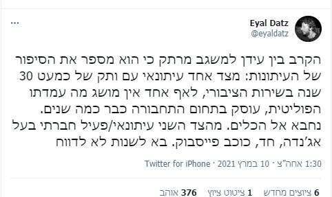ובצד שמאל של הפיד, הנה סיפור קטן על מודעות עצמית ועיתונות חופשית: רזי ברקאי העז להגיד שמרצ, בגלל הקרבה המסוכנת לאחוז החסימה, לא צריכה לרוץ בבחירות הקרובות. מתברר שגם אחרי עשרות שנים של הבעת עמדות שמאל בשידור, הקפצת הימין על הרגליים והתחככות בברנז'ה, יש דברים שלא אומרים. זהבה גלאון צייצה ציוץ כזה, שלהגיד עליו אירוני או לא מודע לעצמו זה לא יהיה הולם מספיק. אפשר להגיד שהיא נשמעה כמו כל עיתונאי הימין ב-40 השנים האחרונות: