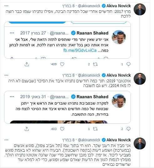 מה שלא הפריע לו להעלות שרשור של ציוצי עבר עם תחזיות, או יותר נכון תחזית אחת שהושמעה במספר גרסאות, של עיתונאי ידיעות אחרונות, רענן שקד, שלא הספיק ככל הנראה למחוק לפני שהמסך צולם. הנה השרשור להנאתכם: