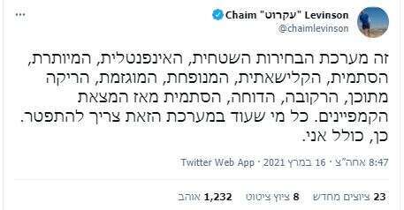 חיים לוינסון, הכתב הפוליטי של עיתון הארץ , הוא צייצן מוכר בטוויטר עם 130.2 אלף עוקבים. רבים וטובים כבר סבלו מלשונו הארסית והקטלנית ומהטרלות שונות ומשונות שהוא נוהג להעלות מדי פעם לרשת. בדרך כלל אני לא משתגע באופן אישי על הסגנון, אבל נדמה לי שהשבוע הוא צייץ את הציוץ המדויק ביותר: