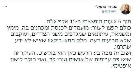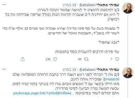 עמיחי אתאלי, הכתב הפוליטי של ידיעות אחרונות, ביקש את עזרת הציבור במקרה קשה של אם יחידנית שנקלעה לקשיים כלכליים. הציוץ הזה צויץ בשעה 15:34: