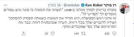 עם יד על הלב: כמה מכם שמעו על השערוריה הזו? באיזה עולם הציוץ של עו"ד מוריס הירש מקבל 15 לייקים, הציוץ של הרצל חג'אג' מקבל 19, והציוץ של רן בוקר על האוזנייה בריאיון ב-YNET מקבל 2,000?