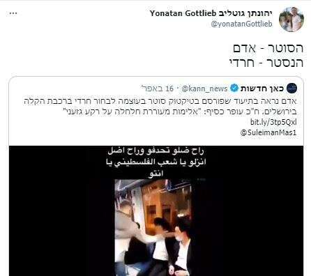 מה שזה באמת זו אלימות והתעללות ביהודים רק כי הם יהודים והם לובשים סממנים יהודיים. זו תחושת אדנות ועליונות מצידם של ערבים צעירים במדינה וצפצוף ארוך מאוד על רשויות החוק. צפצוף, אגב, שיתברר בהמשך כלא־מנותק מהמציאות בכלל. אין אדם נורמלי שחושש שייתפס או יודע שייענש, שיעלה תיעוד של עצמו מבצע עבירה. עצם העובדה שהיא עלתה לרשת החברתית בלי חשש, צריכה להכאיב לנו לא פחות מהסטירות והמכות שחטפו החרדים בירושלים.