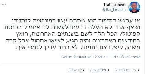 פילבר מתכוון כמובן לאחד התרגילים הישנים בספר של התקשורת הישראלית. במשך שבועות פמפמה בכל במה אפשרית שאם נתניהו יפסיד, המוני אזרחים יעלו על הכנסת או יסייעו לנתניהו להתבצר בבלפור כדי למנוע את חילופי השלטון. התרחיש כונה "קפיטול" כדי לדמות את ההתפרעות וההשתלטות של אוהדי טראמפ ימים לפני החלפתו בנשיא ביידן.