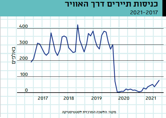 המספרים מדברים בעד עצמם: בשנת 2019 נכנסו לישראל כמעט 5 מיליון תיירים, אבל בשנת הקורונה המספר צנח ב־82%. במהלך 2020 נרשמו רק 900 אלף כניסות מבקרים לישראל, מהן 785 אלף בשלושת החודשים שלפני התפרצות המגפה והחלת המגבלות. התפוסה במלונות בשנת 2020 הגיעה ל־36 אחוזים בהשוואה לשנת 2019, ונרשמה ירידה של יותר מ־80 אחוזים בלינות התיירים.