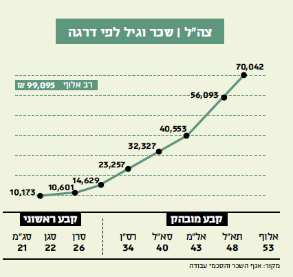 אף שצה"ל זוכה ליוקרה רבה בציבור הישראלי, במובנים רבים הוא מתנהג כמו מגזר ציבורי לכל דבר ועניין. כפי שעולה מדו"ח הממונה על השכר שהתפרסם השבוע, גם בצה"ל, כמו אצל מורים ופקידים – הוותק נושא עימו תשואה גבוהה מאוד. ככל שעולים בסולם הדרגות, כך השכר מטפס באופן תלול יותר. הפער כל כך משמעותי, שבמשרד האוצר מחלקים את משרתי הקבע בצה"ל ל"קבע ראשוני", השנים הראשונות של מסלול הקבע (לרוב עד גיל 28), ו"קבע מובהק" – שלב מאוחר יותר בקריירה. בין שני השלבים יש פער משמעותי בשכר. קצין צעיר מתחיל עם כעשרת אלפים שקלים בחודש, אבל מסיים אותו בגיל 45 עם שכר ממוצע של יותר מ־36 אלף שקלים, שכר שגם בהייטק לא היו מתביישים בו.
