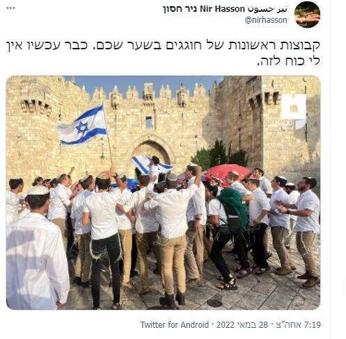 והנה הגיע יום איחוד ירושלים, ועשרות אלפים של בני נוער מבוגרים וטף צעדו ברחובות העיר עם דגלים ושרו שירי שמחה לעיר הבירה של ישראל מאז ימי דוד המלך. ומה עושים אותם עיתונאים? מזעזעים מכמה עשרות או מאות בני נוער ששרו "שיישרף לכם הכפר" בסמטאות העיר העתיקה.
