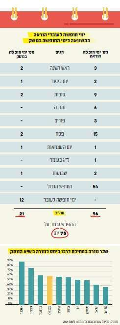 כמה ימי חופשה יש לכם בשנה? אם אתם עובדים "רגילים" במשק יש לכם (לא כולל שבת) 21 ימים בשנה. למורים לעומת זאת, יש 96 ימי חופשה. ברוך השם, כן ירבו. הקנאה וצרות העין מוציאות את האדם מן העולם ומזיקות לעור הפנים, כך אומרים. הבעיה מתחילה כשמסתכלים על הימים שבהם מערכת החינוך נמצאת בחופש, אבל בשאר המשק עובדים כרגיל, כמו ימי אסרו־חג למיניהם, חנוכה, השבוע שלפני פסח, וכמובן – החופש הגדול. קוראים לזה "עומס ימי חופשה", והשאלה היא עד כמה הפער בין החופש של הילדים לחופש של ההורים מעמיס על המשק.