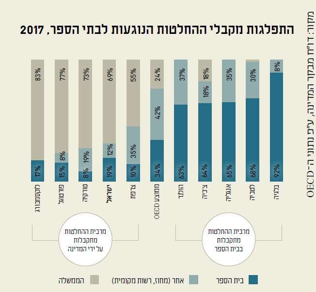 ואם בריכוזיות עסקינן, שימו לב לנתונים האלה של ה־OECD. בתי הספר בישראל מקבלים פחות מעשרים אחוז מההחלטות החינוכיות. את רובן המוחלט, כמעט 70%, מבצע משרד החינוך בירושלים. רק שלוש מדינות מפותחות מחזיקות משרד חינוך ריכוזי יותר משלנו, ברובן מצב העניינים הרבה יותר מבוזר; במדינות האיחוד האירופי מנהלי בתי הספר והמורים מקבלים בממוצע 38% מההחלטות החינוכיות, כפול מהאוטונומיה שניתנת אצלנו.