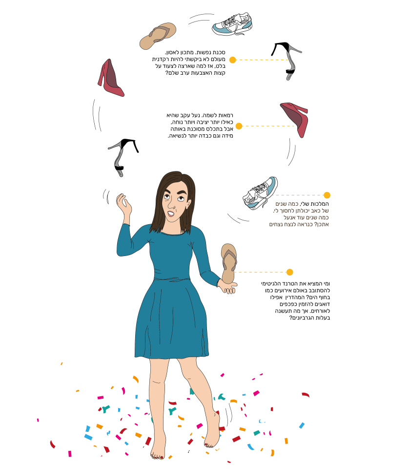 וכך אני מוצאת את עצמי מגיעה לאירועים כשבאמתחתי נעלי עקב, נעליים שטוחות וכפכפים.