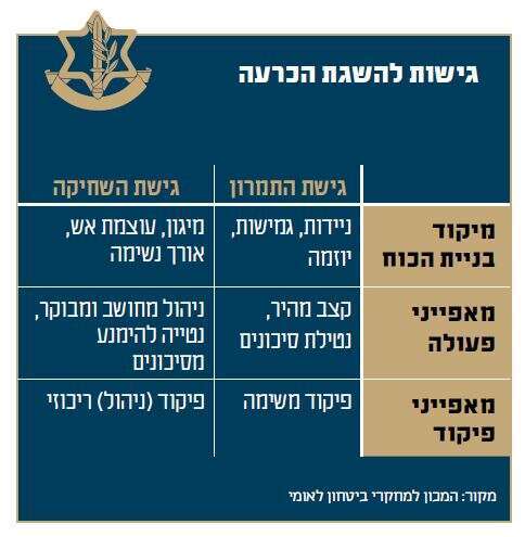 מטריד עוד יותר לראות שצה"ל ממשיך לקרוא למבצע בעזה "תמרון". זו שגיאה מושׂגית שתעלה ביוקר. צה"ל אמור לדעת זאת היטב. למשל, בחוברת שכותרתה "התמרון היבשתי ככלי בביטחון הלאומי", שיצאה על ידי צה"ל עצמו בכתב העת "מערכות" ב־2019 – יחד עם ה־INSS, שיתוף פעולה בעייתי כשלעצמו – מובהר ההבדל בין שתי גישות, "תמרון" ו"שחיקה". אל"מ במיל' יובל בזק, ראש מטה אוגדה 91, מציג שם את הטבלה המופיעה כאן. על כך אפשר להוסיף שחלק משמעותי מתמרון אמור להיות תחבולה, מה שבוודאי לא קורה במבצע הנוכחי, כשיעדי ה"תמרון" מוכרזים מראש על ידי צה"ל.