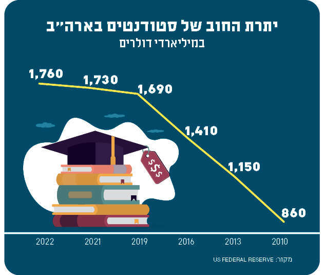 עד כמה מציאות כזו יכולה להיות בעייתית, אפשר ללמוד ממה שקורה מעבר לים ובעיקר בארה"ב. כ־50 מיליון אמריקנים קבורים כיום תחת הר חובות של הלוואות שנטלו בתקופת הלימודים האקדמיים. סך החוב הזה מגיע לסכום עצום של יותר מ־1.7 טריליון דולר. מדובר בנתח ההלוואות הגדול ביותר אחרי המשכנתאות, והוא עוקף את כל סוגי החובות האחרים, כגון כרטיסי אשראי, הלוואות בגין רכישת רכב ואחרות.