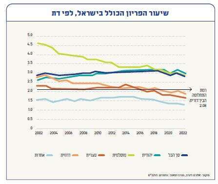 את שנת 2023 סיימנו עם 9.84 מיליון אזרחים, גידול של כ־180 אלף לעומת השנה שעברה, ובאחוזים – גידול של 1.86% באוכלוסיית המדינה, גבוה משמעותית מכל מדינות המערב. מגמת הפריון, לעומת זאת, נמצאת דווקא בירידה. למרות עלייה קלה שנרשמה בתקופת הקורונה, השנה האחרונה חזרה למגמת צניחה במספר הילדים לאישה, בכל המגזרים. בשנים 2022-2018 צנח שיעור הפריון בקרב נשים יהודיות מ־3.17 ל־3.03, ובקרב מוסלמיות מ־3.20 ל־2.91. אצל נוצריות, דרוזיות ושאר קבוצות האוכלוסייה – המספר נמוך אפילו יותר.