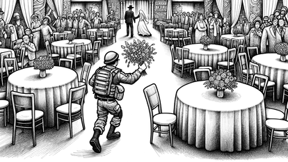 כל יושבי האולם הביטו באורח החריג בנוף, ובנימין עצר לרגע את הדרשה הנלהבת שלו, וצבי החתן כשלבסוף הבחין בחייל העומד בכניסה קם במהירות ורץ אליו והם נפלו זה על צווארו של זה לעיני כולם והתחבקו ארוכות. ויואל, שכאמור ידע הכול, לחש לחבר׳ה מהישיבה, זה בועז, אחיו הגדול של צבי. העוילם אומרים שהוא לוחם אמיץ, חזר מעזה אחרי מאה יום. מרגש, הא?