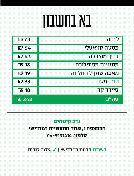 אפשר ללמוד לא מעט על מסעדה מהאופן שבו היא מתחזקת את השירותים שלה. הכלל אומר שככל שהם יותר נקיים ושמורים, כך אפשר לסמוך יותר על רמת ההיגיינה במטבח שלה. ובכן, לא רק שהשירותים ב"נדב קינוחים" מתוקתקים להפליא, אלא שבאופן מפתיע מוצעות בהם מגבות אישיות צחורות לייבוש הידיים, ולוגו המקום רקום עליהן בזהב. מה אפשר להסיק מזה? יומרנות ושאפתנות, התעקשות על חומרי גלם מובחרים גם היכן שאף אחד אחר לא חשב עליהם והצבת סטנדרט חסרי תקדים.