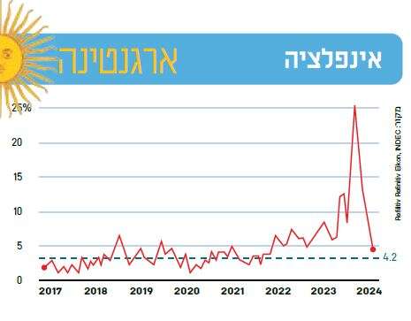 זהו עדיין קצב רצחני למדי של שחיקת כסף. במונחים שנתיים, גם עכשיו מתמודדת ארגנטינה עם אינפלציה של 276%. לשם השוואה, האינפלציה בישראל עומדת כרגע על 2.8% לשנה, ובשיאה, בתחילת 2023, היא עמדה על 5.4%. בארגנטינה, לעומת זאת, היא עברה אז את ה־100% לבלי שוב. שיעור חד־ספרתי של אינפלציה שנתית לא נצפה שם כבר יותר מעשור.