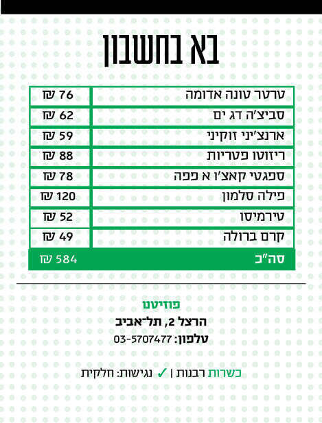 לפוזיטנו יש יכולת ליצור חוויה איטלקית שלמה וכיפית - תפריט עם מנות נכונות, אווירה שהיא כל מה שאתה מצפה ממסעדה תל־אביבית עכשווית ומיקום בלייני. התוצאה, לפחות כרגע, היא "ליד". עם שיוף נוסף של השירות ובעיקר של הביצוע היא יכולה להגשים את ייעודה. או אז אולי גם תזכה לשרוד יותר מקודמותיה באכסניה הראויה לכך.
