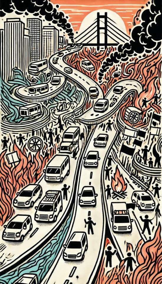 הקמפיין הלך מצוין. יותר ויותר מצביעים מלאי תקווה נדדו לכיוונו של איתן יציב, שניצח את הבחירות בהליכה. נדמה היה שהחיים שבים לשגרתם, אבל שנתיים לאחר מכן, בבוקר צונן וסגרירי, פקדה את המדינה סערה פתאומית. בשל התשתיות שלא תוקנו כראוי עוד מרעידת האדמה, התוצאות היו קשות. כבישים הוצפו, מכוניות נסחפו, עצים ועמודי חשמל קרסו בזה אחר זה. בצומת "אל חזור" התפתח פקק גדול שהתפשט כמו נגיף ויראלי לכל עורקי התחבורה של המדינה. עבר שבוע ימים עד שחילצו את הנהגים מתוך הרכבים. אמבולנסים לא הצליחו להגיע לבתי החולים, רבים שילמו בחייהם. האירוע חזר על עצמו במהלך אותה שנה בצורות שונות. כל תאונה או מפגע בדרך, כל סערה או שריפה היו יוצרים במדינה פקקי ענק שמשתקים אותה למשך שעות ארוכות, לעיתים גם ימים.