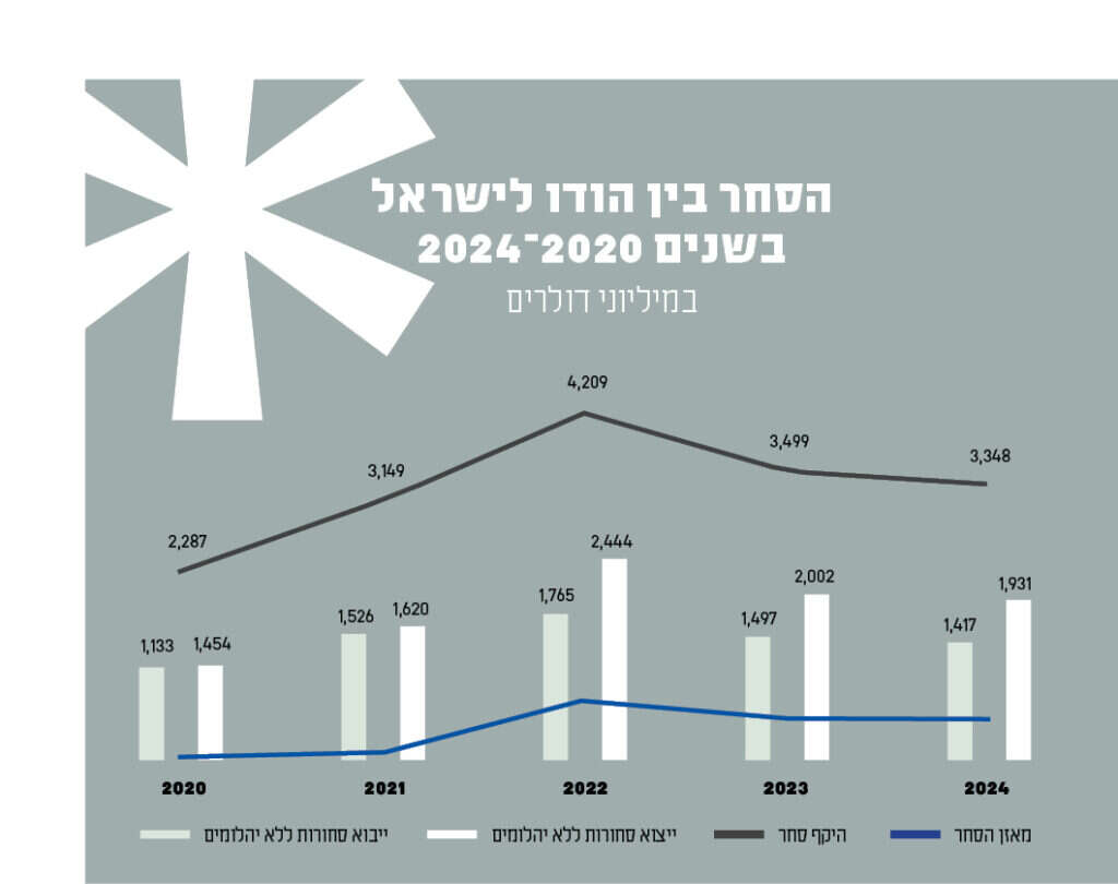 הודו יכולה להיות שותפת סחר חשובה של ישראל. כיום היקף הסחר בין המדינות אינו גדול, והוא עומד על כ־3.5% בלבד מכלל הייצוא בישראל, וכולל בעיקר מוצרי תחבורה, כימיקלים, מכשור רפואי ותוצרת חקלאית. ייצוא הסחורות והשירותים מישראל להודו עמד בשנת 2024 על כ־2.4 מיליארד דולר (ללא יהלומים), והייבוא מהודו לישראל הסתכם בכ־1.4 מיליארד דולר. בשנים האחרונות אף נרשמה ירידה בהיקף הסחר בין המדינות. הייצוא ירד מרמת שיא של כ־2.4 מיליארד דולר בשנת 2022, לרמה של כ־2 מיליארד דולר בשנת 2024. הייבוא מהודו ירד מ־1.8 מיליארד דולר, לכ־1.4 מיליארד. במנהל סחר החוץ של ישראל מייחסים זאת להשפעת המלחמה, שפגעה בהיקפי הייצוא והייבוא.