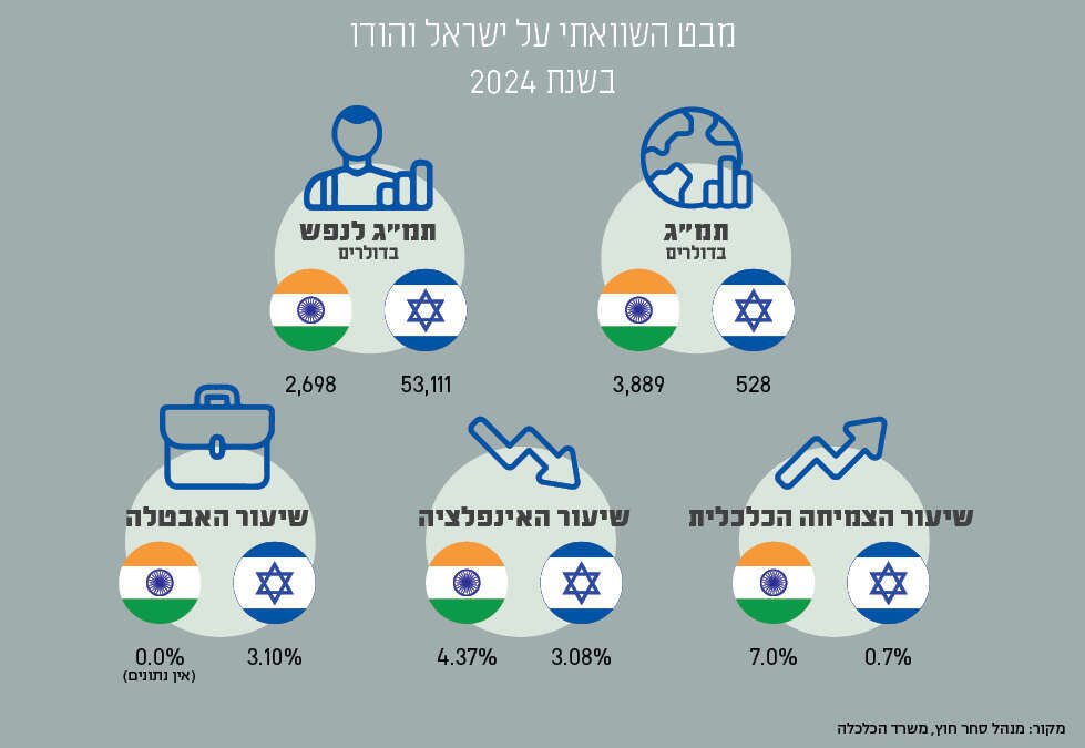 חלק גדול משיתופי הפעולה הללו נוגעים כמובן בכלכלה. במשרד הכלכלה רואים את המשלחת שיצאה השבוע כהזדמנות להעמקת הקשרים הכלכליים בין המדינות. כאמור, כיום הודו היא הכלכלה החמישית בגודלה בעולם, ועד 2030 היא צפויה להפוך לכלכלה השלישית, אחרי ארצות הברית וסין. בעשור האחרון הציגה הודו צמיחה כלכלית אדירה של כ־7%, והכפילה את התוצר לכ־4 טריליון דולר. זהו שוק אדיר וצומח, שעובר בעשורים האחרונים תמורות משמעותיות. הזדמנויות הסחר שגלומות בו עבור ישראל הן גדולות.