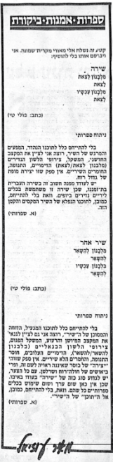 את היצירה הראשונה שלו אני גם מכיר, זו שהופיעה בדפוס בכלי תקשורת מרכזי ארצי. את הקטע (מצורף פה) הוא שלח אליי כשהיה בחור צעיר בקריית־שמונה, עוד קורא שלא הכרתי ששלח אליי מכתב בדואר. לא היססתי הרבה ופרסמתי את הטקסט הנוקב. הכנתי כותרת גרפית שהיא חיקוי של ראש מדור ספרותי, ואחריה רק את המילים המעטות שלי: "קטע זה נשלח אליי מאורי מקריית־שמונה. אני מפרסם אותו בלי להוסיף".