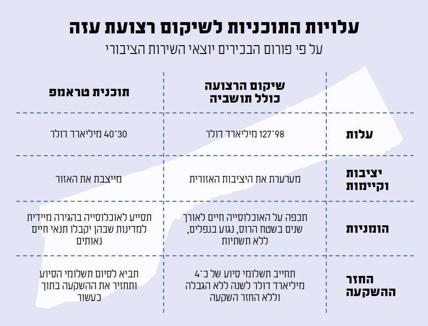 כשלוקחים בחשבון את כלל העלויות של שיקום הרצועה כשהיא ריקה מתושבים, מדובר על כ־10־15 מיליארד דולר לפינוי ההריסות, כולל שינוע והטמנה של הריסות מזוהמות. הקמת תשתיות חדשות היא משימה קלה וזולה יחסית, ויכולה להתבצע במהירות בשיטת שתי וערב. יחד עם מענקי ההגירה מרצון, מדובר על עלות כוללת של כ־30־40 מיליארד דולר.