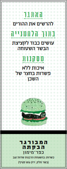 בלי פשרות. "המבורגר קלאסי עם תוספת ביצת עין": קודם כול מעל ומתחת כל המבורגר יושבת הלחמנייה - חומה מבחוץ ואוורירית מבפנים, טרייה ורכה בצריבה קלה. הבחור החביב, תלמיד הישיבה התיכונית המקומית, כנראה בלבל בין הביצה לקציצה, והוציא לנו ביצה מדיום־רייר, אבל אחרי שהפנינו את תשומת ליבו לעניין, החזיר אותה לבישול קצרצר, ולשמחתנו לאחריו היא עדיין נותרה בחלמון כתמתם ויפה. וכוכב האירוע - ההמבורגר, בשר טרי, איכותי וצרוב יפה, אדמדם בפנים, עסיסי ונוטף. לתחושתנו היו בו 20 אחוזי שומן לפחות, יוצא מן הכלל. חומרי הגלם איכותיים כל כך עד שגם נער שאינו יודע מימינו ומשמאלו יכין אותו נפלא.