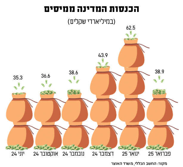 בינתיים, מתחילת השנה ניכר עודף גדול בגביית מיסים. על פי נתוני האוצר, בחודשים ינואר־פברואר זינקו ההכנסות ממיסים בכמעט 30% לעומת התקופה המקבילה אשתקד. בינואר עצמו נרשם שיא בגביית מיסים – 62 מיליארד שקל. כתוצאה מכך, הגירעון במשק – שנובע מגידול בהוצאות העולה על ההכנסות – הצטמצם בחודש פברואר בצורה ניכרת. לשם השוואה, בחודש אוגוסט האחרון עמד הגירעון על 8.5%, ואילו בסוף פברואר הוא ירד ל־5.3%.