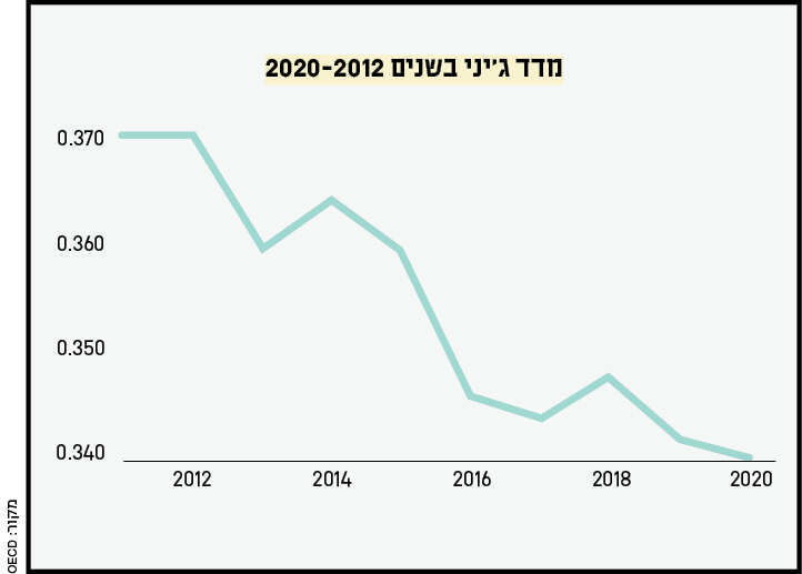 יש עם המדד הזה אינספור בעיות, בעיקר משום שהוא מודד הכנסה חודשית ותו לא, וכדאי תמיד לקחת אותו עם גרגר נכבד של מלח, אבל ברבות השנים הוא הפך לנפוץ ביותר ולפרמטר המקובל כשמדברים על אי־שוויון בתוך מדינות. אפשר כמובן לפתח גם דיון ערכי על צמצום אי־שוויון ועד כמה הוא צריך להיות יעד מרכזי, לעומת השאיפה להעלות את רמת החיים לחברה בכללותה בלי להתמקד בפערים דווקא. חשוב לציין גם שבהשוואה בינלאומית אי־השוויון בישראל אכן גבוה יותר מבמדינות אחרות. אבל אני מזכיר שוב לשם מה התכנסנו: לתאר מגמות חיוביות של "מוסיף והולך" בכלכלה שלנו. ובכן, בתקופה האחרונה אי־השוויון אצלנו פוחת והולך.