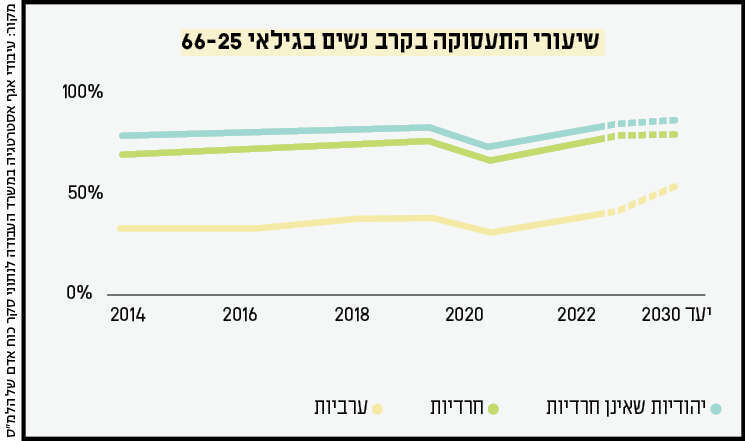 נשים ערביות הן הקבוצה שמשתתפת הכי מעט בתעסוקה – בקושי 42% מהן רשומות כעובדות. זה מצב קשה, אבל המגמה היא מה שחשוב, והיא טסה בכיוון חיובי מאוד. בתחילת שנות האלפיים רק חמישית מהערביות עבדו, נתון שהוכפל תוך שני עשורים. במקביל הן גם זורמות להשכלה גבוהה בקצב מטאורי. מספר הסטודנטיות מהמגזר הערבי שילש את עצמו בשנים האחרונות, וכיום שליש מבנות השלושים עברו באקדמיה, לעומת רק 7% לפני עשרים שנה. גם אלה שאינן עושות תואר הכפילו את כוחן בשוק העבודה. הדור הצעיר של הערביות מתקרב לשיעורי התעסוקה במגזר היהודי בגיל מקביל, ומשפיע גם על דור האימהות שמצטרפות בשנים האחרונות לשוק העבודה גם אחרי גיל חמישים, שנחשב מחסום כמעט בלתי עביר אצל יהודיות.
