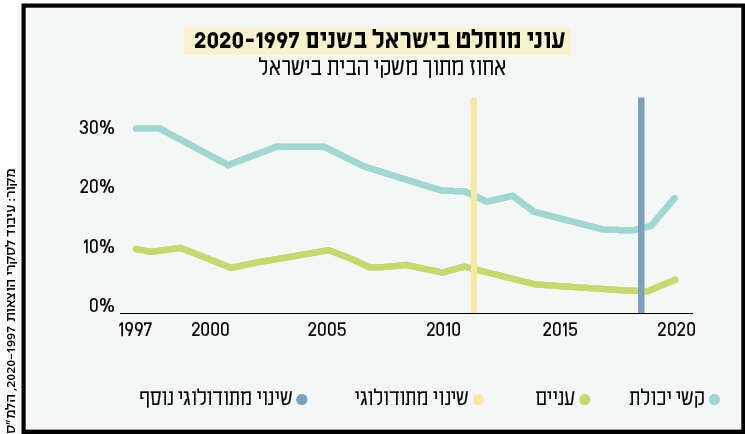 לפני כשנה הקדשנו כאן טור שלם לשאלה המורכבת כיצד מודדים עוני. כמו במקרה של אי־השוויון, גם כאן יש ויכוח מקצועי וערכי בשאלה היכן להתמקד כאשר אנו באים לבדוק את שיעורי העוני, כאשר כולם מסכימים כמובן עם הצורך לצמצם את העוני כמה שיותר. הגרף שלפניכם, פרי עבודתם של תום שדה ועידן ארץ, מתאר עוני אבסולוטי בישראל, והוא בירידה מבורכת.