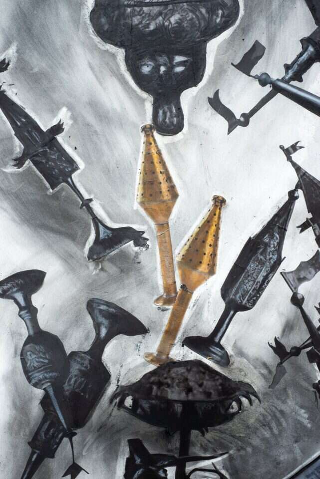 על קירות נוספים של הגלריה הרחבה והמוארת, מוצגות עבודות מסקרנות, אשר משקפות שלבים שונים בתהליך שחוותה האמנית. תהליך החיפוש וההליכה במרחבים של זמן ושל זהות, מוצאים ביטוי בתהליך היצירה: המספריים גוזרות ומוציאות, עורמות את הסמלים ואת השאריות שנותרים מהם. הם עבורי כלי עבודה לחיפוש, וגם כלי לגעגוע ולכמיהה. עם המספריים אני מוציאה את הדימוי ממקומו ומעבירה בנדודים למקום חדש, איתן אני גם פורמת את השכבות והחוטים".