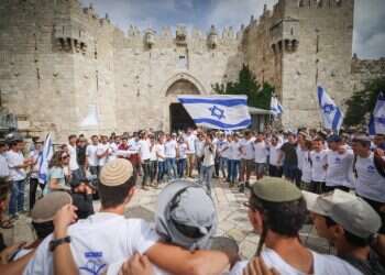 מסורת של חמישים שנה – אלפי אנשים חוגגים את איחוד ירושלים במלחמת ששת הימים, בריקוד הדגלים המסורתי, שהתחיל במרכז העיר ...